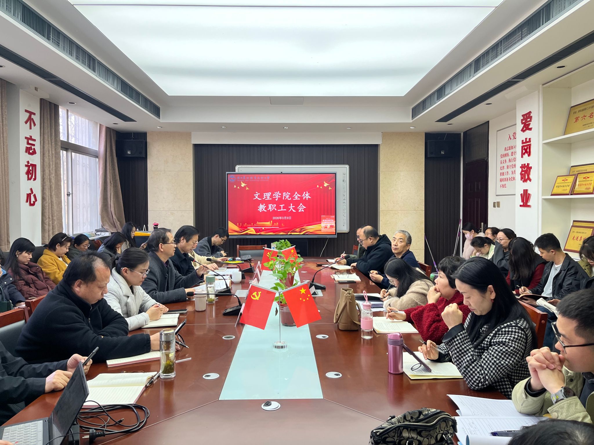 3月9日下午,文理学院召开“2026年开学工作会暨全面从严治党工作会”,传达学校有关会议精神,安排部署开学各项工作,启动树立和践行正确政绩观学习教育。会议由王云江院长主持,全体教师参加了会议。